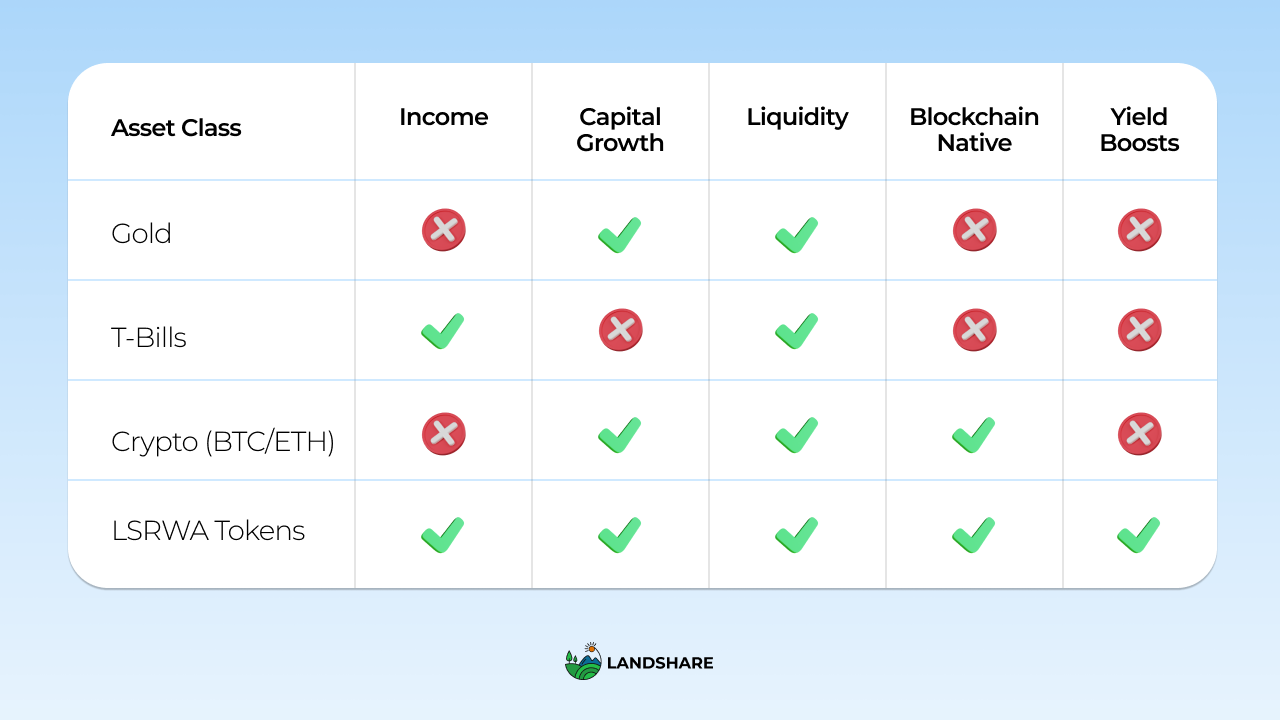 Compared to conventional options like gold or T-bills, tokenized real estate offers a compelling advantage:
