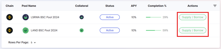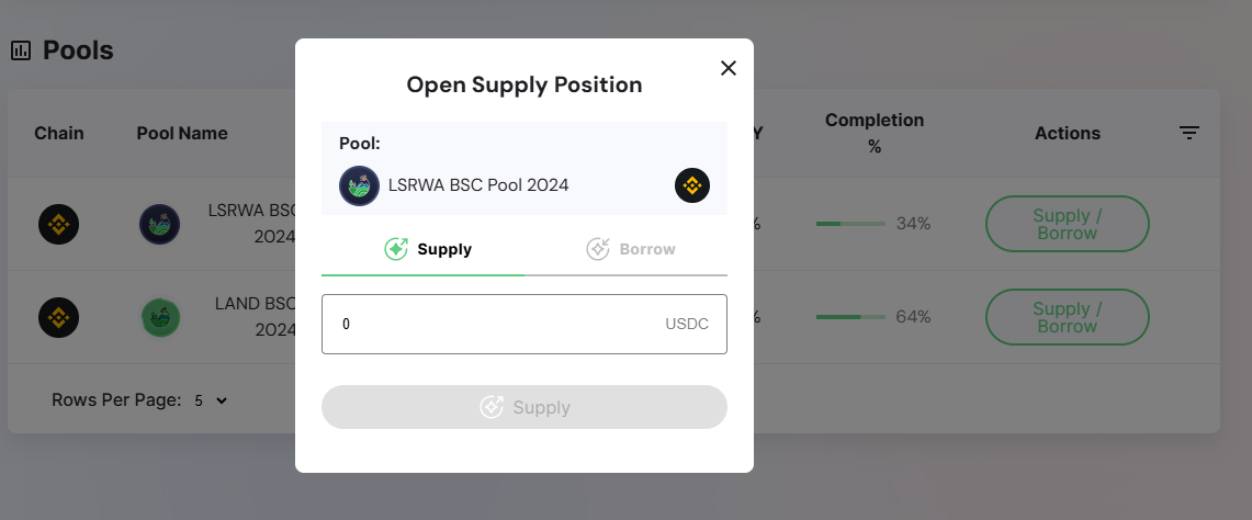 The process of borrowing USDC by pawning your LSRWA and LAND tokens is straightforward. Let’s walk through it: